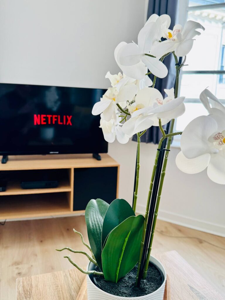 Un salon lumineux avec canapé 4 places, télévision connectée avec Netflix et chaînes incluses